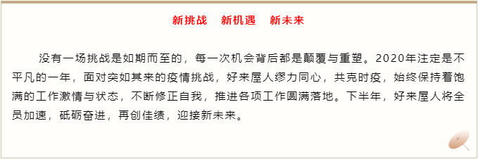 7月25日,好來屋裝飾2020年半年度總結會議在公司沙湖會多功能廳圓滿舉行。本次會議,全面總結上半年工作,分享成績,深剖不足。部署安排下半年工作,推進各項任務目標落實。